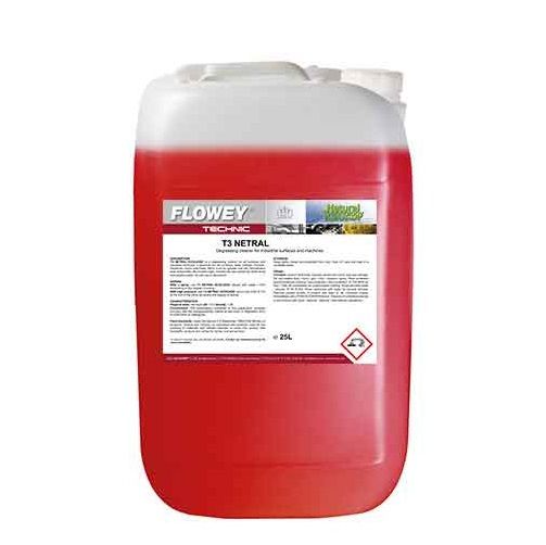 T4 NETRAL EXTRA es un limpiador desengrasante apto para la limpieza de cualquier superficie y maquinaria industrial. Disuelve la suciedad de suelos, paredes, techos, mobiliario, chimeneas, hornos, maquinaria y filtros, producida por gasóleo, grasas, polvo atmosférico o aceites de origen animal, vegetal y mineral, de manera óptima y sin alterar la calidad alimentaria. No se debe aplicar sobre aluminio.